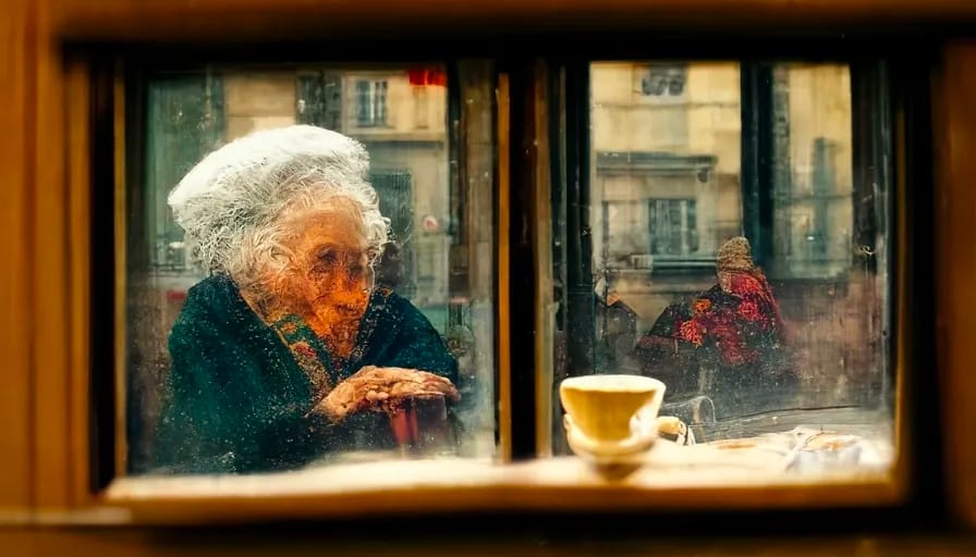 MJ V3 - /imagine a photo of an old lady sitting by the window in a french café, looking out the window, holding a cup of tea --ar 16:9