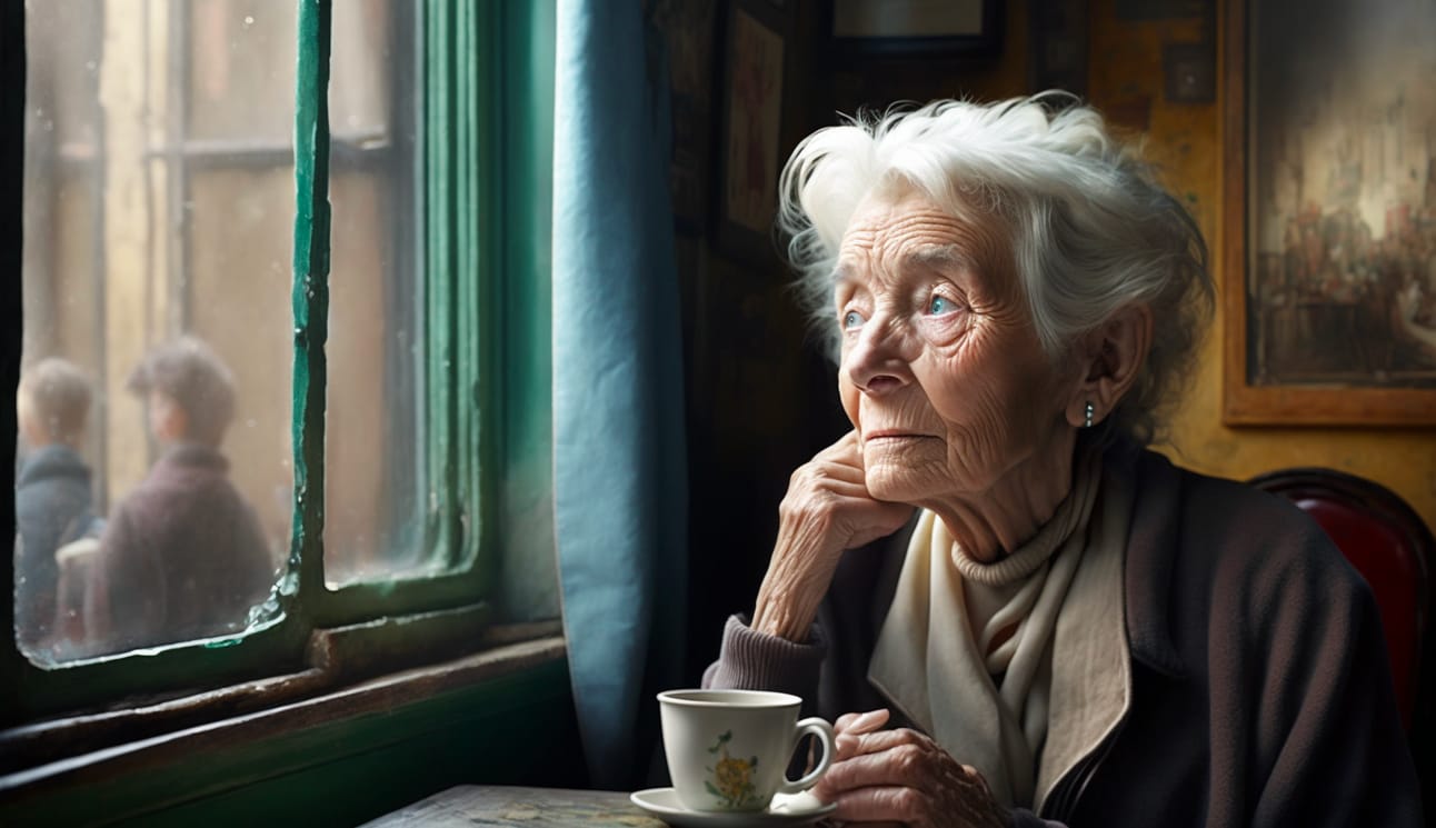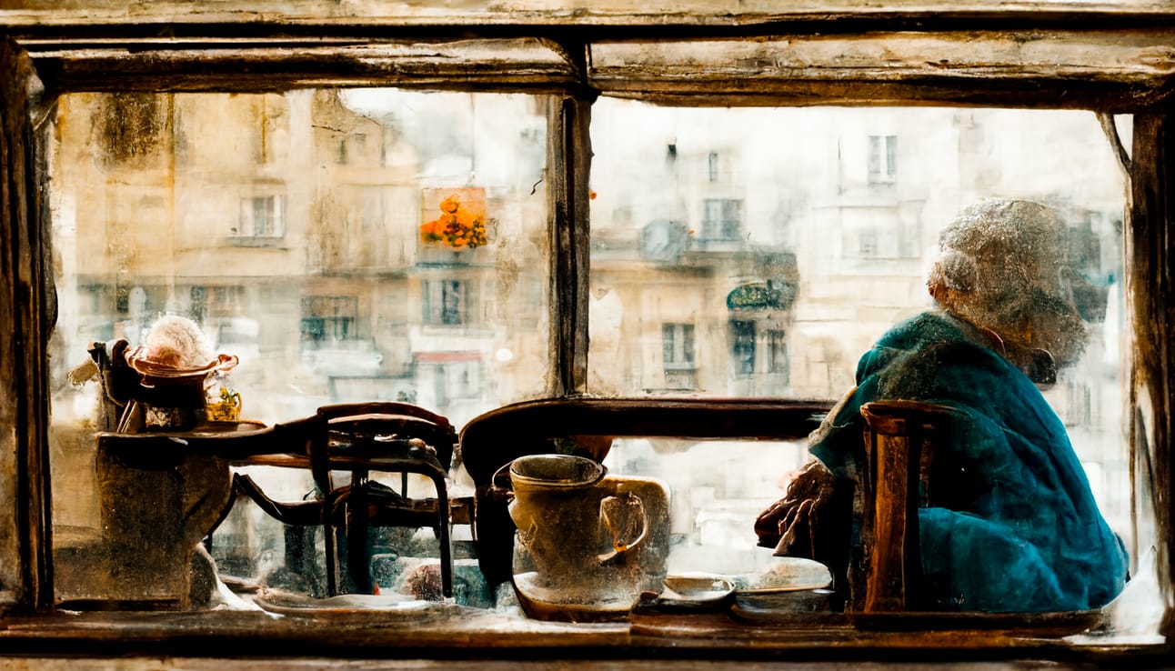 MJ V4 - /imagine a photo of an old lady sitting by the window in a french café, looking out the window, holding a cup of tea --ar 16:9
