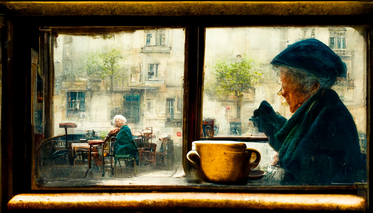 MJ V1 - /imagine a photo of an old lady sitting by the window in a french café, looking out the window, holding a cup of tea --ar 16:9